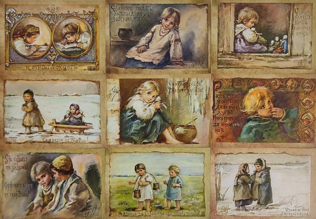 До революции открытки выпускали в разных техниках. Их расписывали вручную, украшали блестками, цветами и ароматами. Популярными сюжетами были зимние пейзажи, семейные сцены, Дед Мороз и Снегурочка.